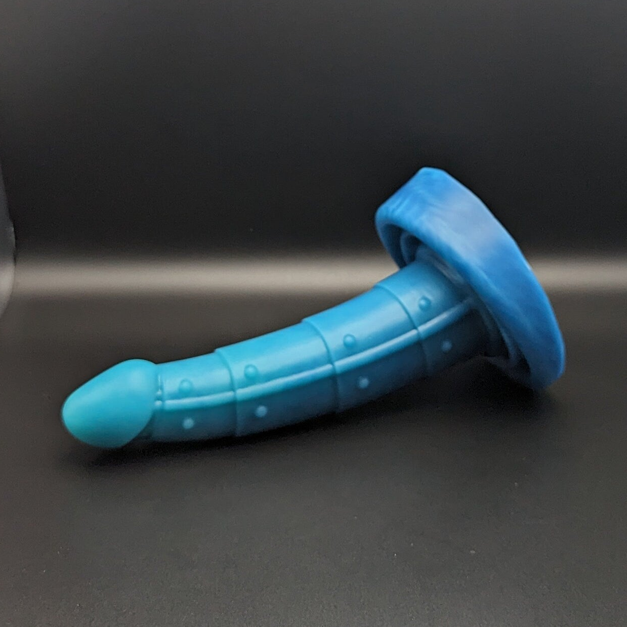 An earth-dragon inspired dildo with hard ridges in the back, and smooth bumps on the front.